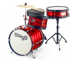 Sada dětských bubnů, 3-dílná včetně stoličky a paliček. Skladá se z 12" velkého bubnu, 10" malého bubnu, 8" přechodu a 8" činelu. Součástí jsou stojany, šlapka k velkému bubnu, stolička, pár paliček a ladicí klíč. Barva modrá/červená stínovaná.