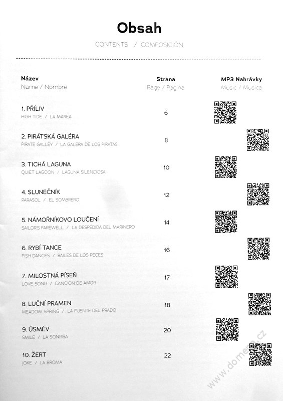 Deset kytarových skladeb v posloupné obtížnosti od lehkých až po mírně pokročilé. Součástí jsou i QR kódy u každé skladby pro náslech možné interpretace.