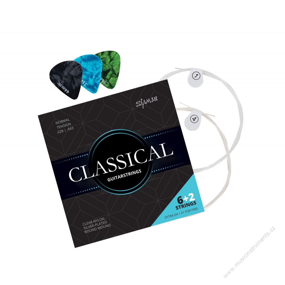 Shaman Classical struny pro koncertní kytaru, 2 náhradní struny a 3 trsátka
