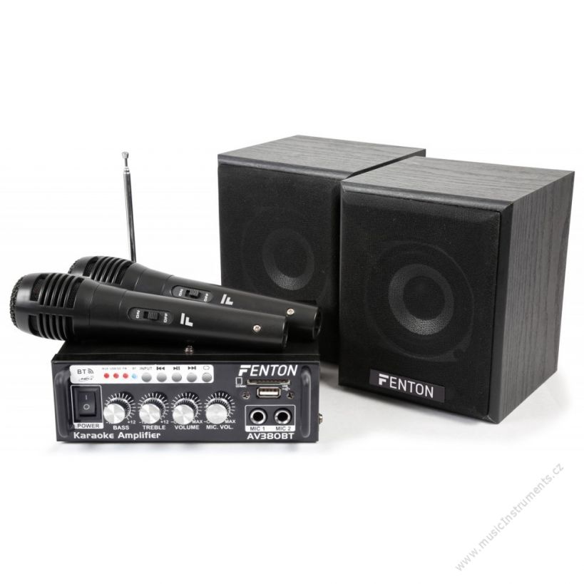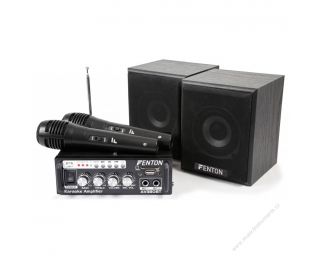 KARAOKE zvuková sestava vhodná pro každou párty. Sestava obsahuje kompaktní zesilovač, dvojici ručních mikrofonů a dva širokopásmové reproduktory. Zesilovač o výkonu 2x 40W je vybaven MP3 přehrávačem, FM tunerem, Bluetooth přijímačem a linkovým vstupem RCA. SD slot a USB port, ovládací panel pro přehrávání skladeb a výběr vstupního signálu. 2 pásmové korekce, regulace hlasitosti mikrofonních vstupů a úrovně výstupního signálu systému. Zabudované ochranné obvody proti přetížení. Sestava je dodávána včetně všech potřebných propojovacích kabelů.