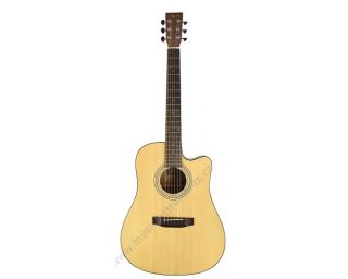 Dreadnought (lidově Western) s vrstvénou horní deskou|n|Tento model má širší nultý pražec 48mm|n||n|Korpus - Basswood|n|Výřez - cutaway|n|Top - smrk|n|Krk - mahagon|n|Hmatník - brownwood|n|Poziční značky - bílé tečky|n|Kobylka - brownwood|n|Nultý a kobylkový pražec - kost bílá|n|Výložka - černá|n|Ladící mechaniky - chrom , olejové|n|Menzura - 647,7mm|n||n|Barva - natural|n|Lak - mat
